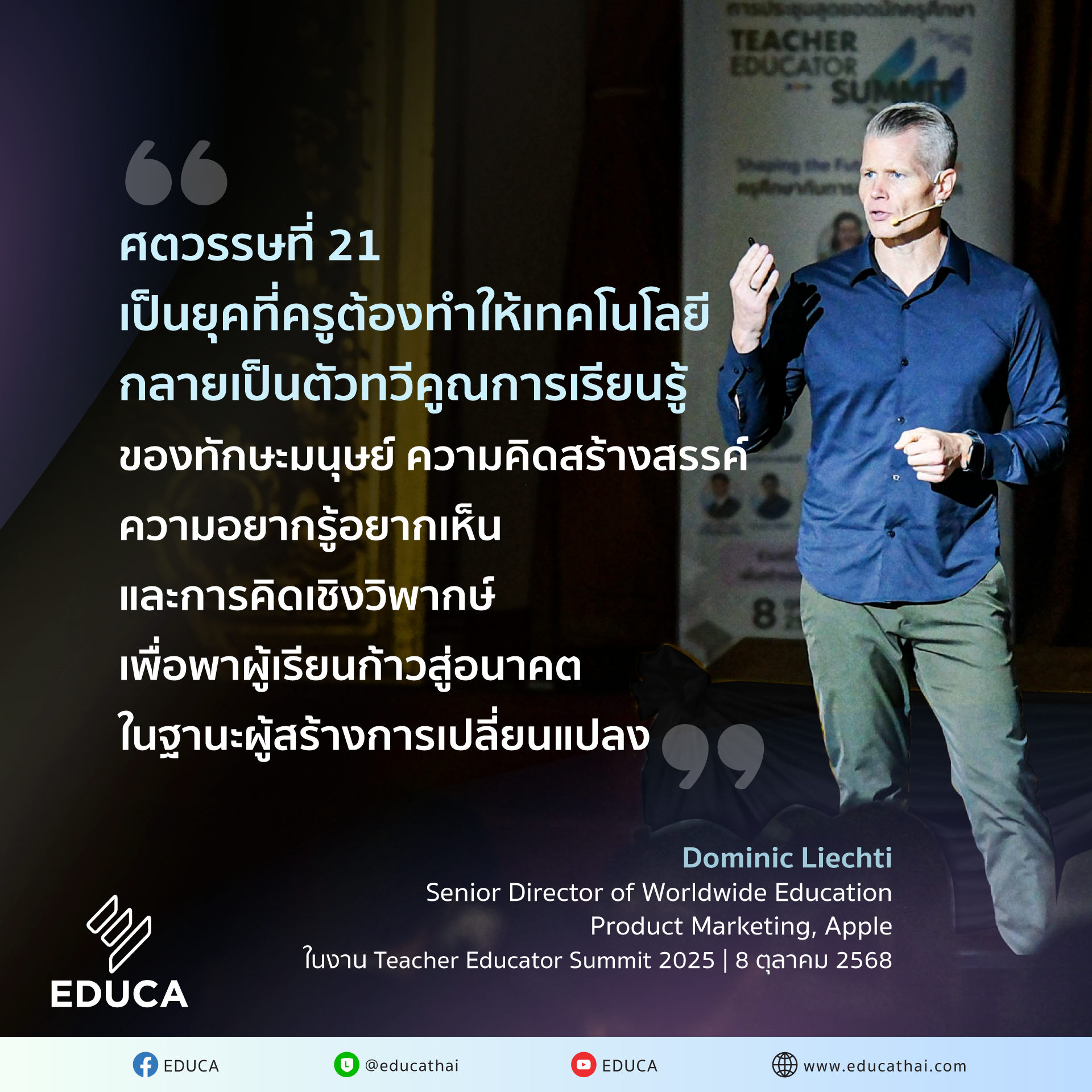 หัวใจสำคัญของการบรรยายหัวข้อ Beyond the Horizon – Leading Through an Evolving Era of Learning โดย Mr. Dominic Liechti, Senior Director, Worldwide Education Product Marketing, Apple ในงาน คือ การยืนยันแนวคิดยึดมนุษย์เป็นศูนย์กลาง (Human-centered) โดยรับบทเป็นผู้ใช้เทคโนโลยีให้สอดคล้องกับจุดมุ่งหมายของการเรียนรู้ เพื่อสร้างคุณค่าให้กับบทเรียน กล่าวคือ สร้างการเรียนรู้ที่สอดรับกับบริบทและการจัดการเรียนรู้ที่มีความหมาย